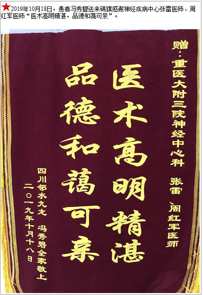 患者冯秀碧送来锦旗感谢神经疾病中心张雷医师、周红军医师“医术高明精湛,品德和蔼可亲”-锦旗-患者心声-患者服务-重庆医科大学附属第三医院【官方网站】