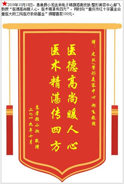 患者颜小淞送来电子锦旗感谢皮肤/整形美容中心郝飞教授,同时向“医疗救助基金”捐赠善款100元-锦旗-患者心声-患者服务-重庆医科大学附属第三医院【官方网站】