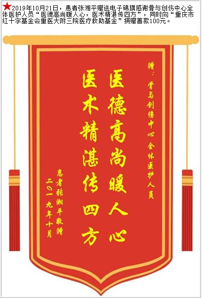 患者张湘平赠送电子锦旗感谢骨与创伤中心全体医护人员,同时向“医疗救助基金”捐赠善款100元-锦旗-患者心声-患者服务-重庆医科大学附属第三医院【官方网站】
