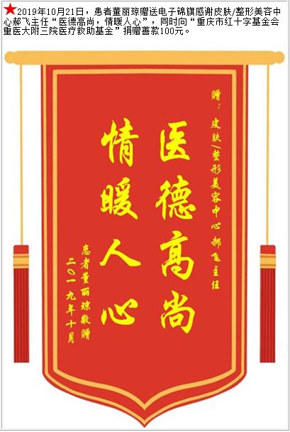 患者董丽琼赠送电子锦旗感谢皮肤/整形美容中心郝飞主任,同时向“医疗救助基金”捐赠善款100元-锦旗-患者心声-患者服务-重庆医科大学附属第三医院【官方网站】