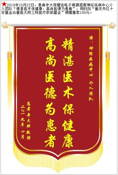 患者辛大琼赠送电子锦旗感谢神经疾病中心介入团队,同时向“医疗救助基金”捐赠善款100元-锦旗-患者心声-患者服务-重庆医科大学附属第三医院【官方网站】