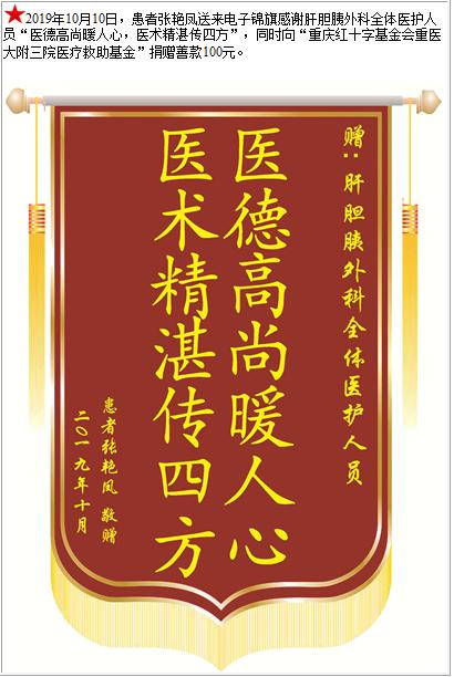 患者张艳凤送来电子锦旗感谢肝胆胰外科全体医护人员,同时向“医疗救助基金”捐赠善款100元-锦旗-患者心声-患者服务-重庆医科大学附属第三医院【官方网站】