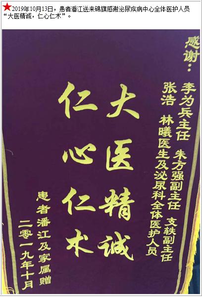 患者潘江送来锦旗感谢泌尿疾病中心全体医护人员“大医精诚,仁心仁术”