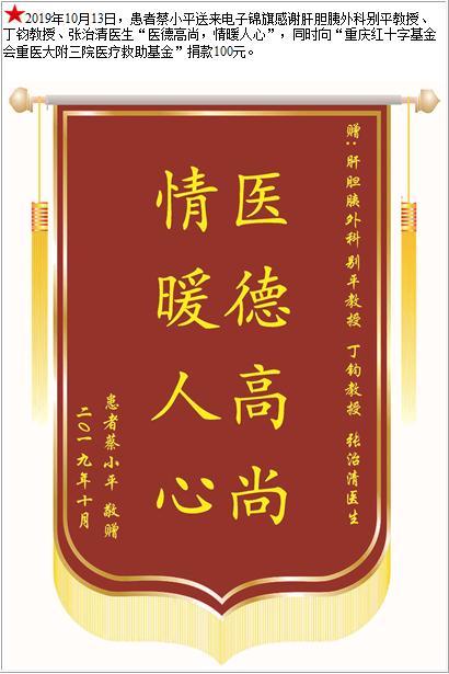 患者蔡小平送来电子锦旗感谢肝胆胰外科别平教授等人,同时向“医疗救助基金”捐款100元-锦旗-患者心声-患者服务-重庆医科大学附属第三医院【官方网站】