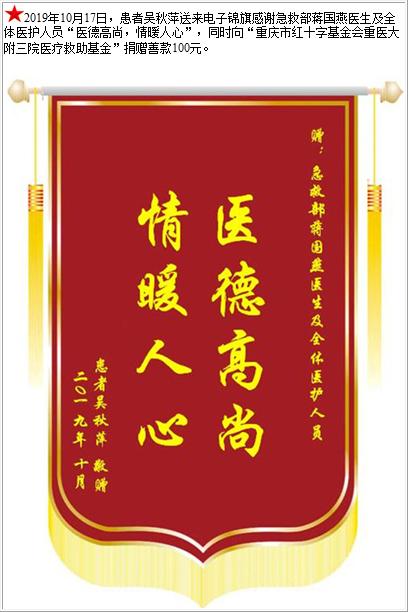 患者吴秋萍送来电子锦旗感谢急救部蒋国燕医生及全体医护人员,同时向“医疗救助基金”捐赠善款100元-锦旗-患者心声-患者服务-重庆医科大学附属第三医院【官方网站】