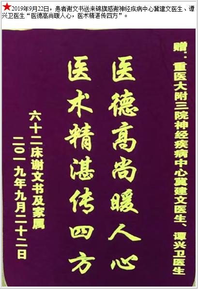 患者谢文书送来锦旗感谢神经疾病中心冀建文医生、谭兴卫医生-锦旗-患者心声-患者服务-重庆医科大学附属第三医院【官方网站】
