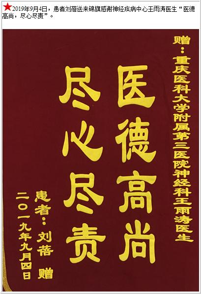 患者刘蓓送来锦旗感谢神经疾病中心王雨涛医生-锦旗-患者心声-患者服务-重庆医科大学附属第三医院【官方网站】