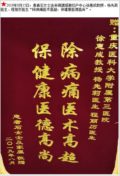 患者石女士送来锦旗感谢妇产中心徐惠成教授、杨先莉医生、程丽历医生-锦旗-患者心声-患者服务-重庆医科大学附属第三医院【官方网站】