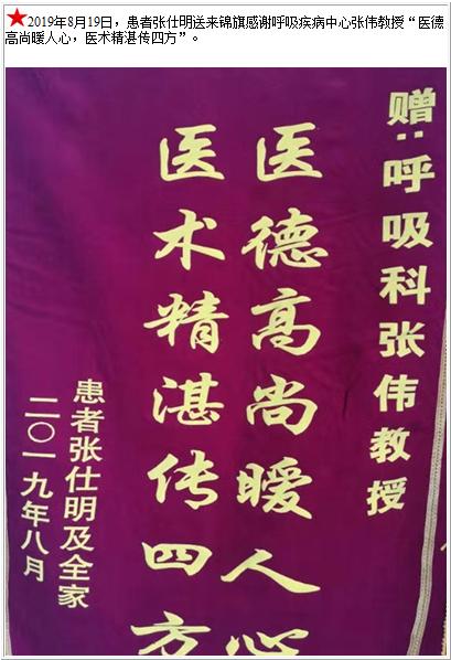 患者张仕明送来锦旗感谢呼吸疾病中心张伟教授