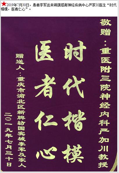 患者李军送来锦旗感谢神经疾病中心严家川医生-锦旗-患者心声-患者服务-重庆医科大学附属第三医院【官方网站】