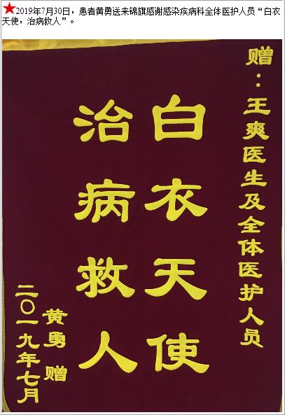 患者黄勇送来锦旗感谢感染疾病科全体医护人员