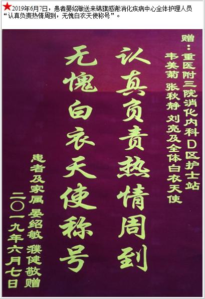 患者晏绍敏送来锦旗感谢消化疾病中心全体护理人员-锦旗-患者心声-患者服务-重庆医科大学附属第三医院【官方网站】