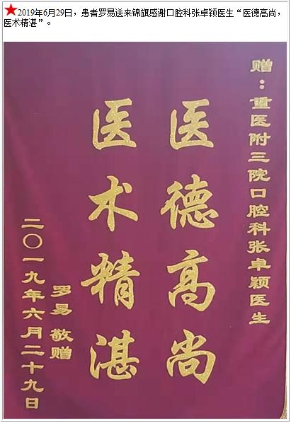 患者罗易送来锦旗感谢口腔科张卓颖医生-锦旗-患者心声-患者服务-重庆医科大学附属第三医院【官方网站】