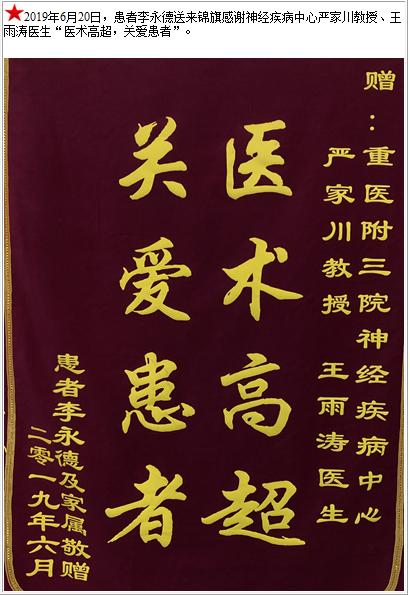 患者李永德送来锦旗感谢神经疾病中心严家川教授、王雨涛医生-锦旗-患者心声-患者服务-重庆医科大学附属第三医院【官方网站】