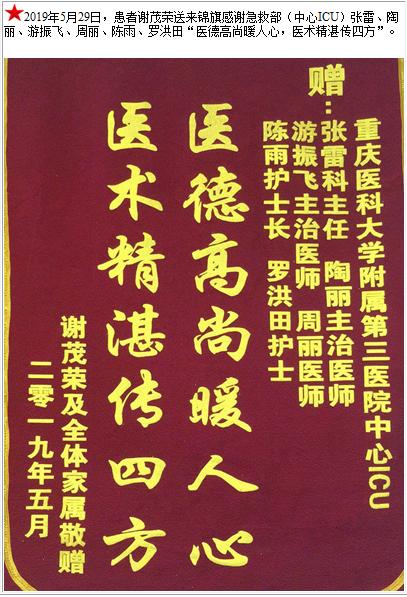 患者谢茂荣送来锦旗感谢急救部(中心ICU)张雷、陶丽、游振飞、周丽、陈雨、罗洪田-锦旗-患者心声-患者服务-重庆医科大学附属第三医院【官方网站】