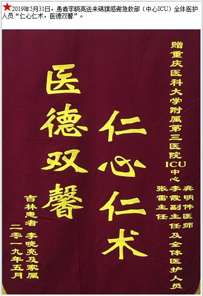 患者李晓亮送来锦旗感谢急救部(中心ICU)全体医护人员-锦旗-患者心声-患者服务-重庆医科大学附属第三医院【官方网站】