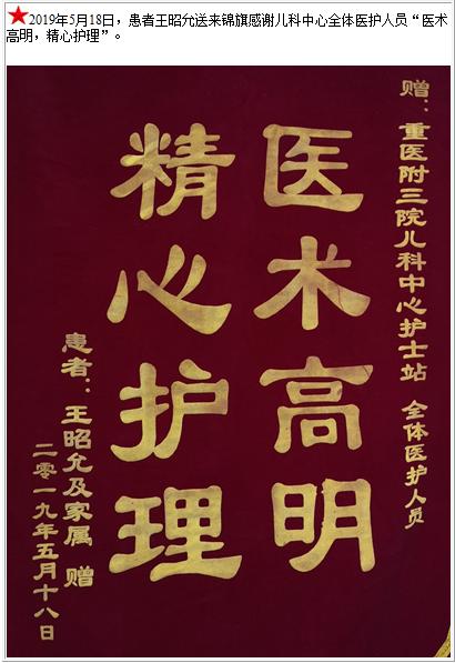 患者王昭允送来锦旗感谢儿科中心全体医护人员-锦旗-患者心声-患者服务-重庆医科大学附属第三医院【官方网站】