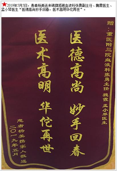患者杨美送来锦旗感谢血液科张勇副主任、魏霞医生、孟小琴医生-锦旗-患者心声-患者服务-重庆医科大学附属第三医院【官方网站】