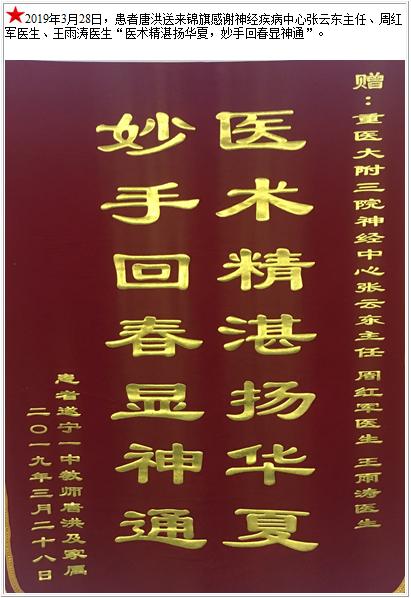 患者唐洪送来锦旗感谢神经疾病中心张云东主任、周红军医生、王雨涛医生-锦旗-患者心声-患者服务-重庆医科大学附属第三医院【官方网站】