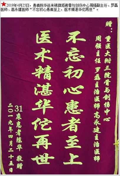 患者陈华送来锦旗感谢骨与创伤中心周强副主任、罗磊医师、高永建医师-锦旗-患者心声-患者服务-重庆医科大学附属第三医院【官方网站】