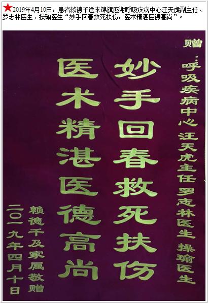 患者赖德千送来锦旗感谢呼吸疾病中心汪天虎副主任、罗志林医生、操瑜医生