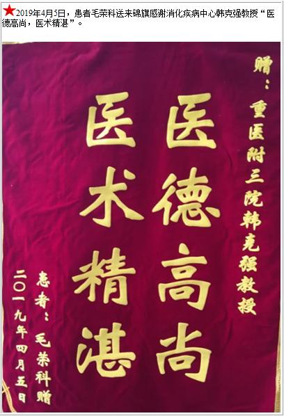 患者毛荣科送来锦旗感谢消化疾病中心韩克强教授-锦旗-患者心声-患者服务-重庆医科大学附属第三医院【官方网站】