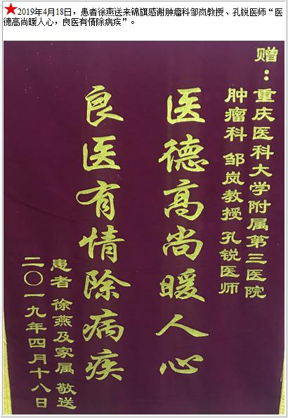 患者徐燕送来锦旗感谢肿瘤科邹岚教授、孔锐医师-锦旗-患者心声-患者服务-重庆医科大学附属第三医院【官方网站】