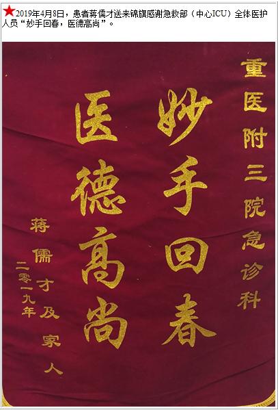 患者蒋儒才送来锦旗感谢急救部(中心ICU)全体医护人员-锦旗-患者心声-患者服务-重庆医科大学附属第三医院【官方网站】