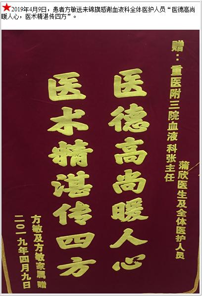 患者方敏送来锦旗感谢血液科全体医护人员-锦旗-患者心声-患者服务-重庆医科大学附属第三医院【官方网站】