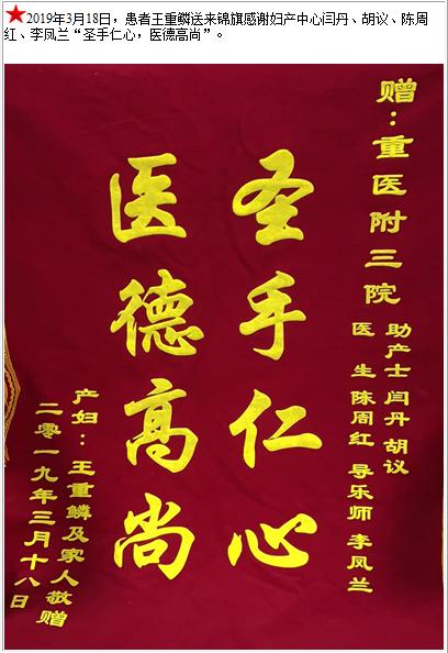 患者王重鳞送来锦旗感谢妇产中心闫丹、胡议、陈周红、李凤兰-锦旗-患者心声-患者服务-重庆医科大学附属第三医院【官方网站】