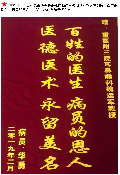 患者华勇送来锦旗感谢耳鼻咽喉科魏运军教授-锦旗-患者心声-患者服务-重庆医科大学附属第三医院【官方网站】