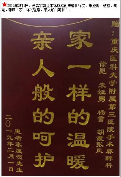 患者家属送来锦旗感谢麻醉科徐昆、朱娅男、杨雪、胡霞、张凤-锦旗-患者心声-患者服务-重庆医科大学附属第三医院【官方网站】