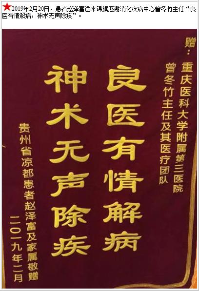 患者赵泽富送来锦旗感谢消化疾病中心曾冬竹主任-锦旗-患者心声-患者服务-重庆医科大学附属第三医院【官方网站】