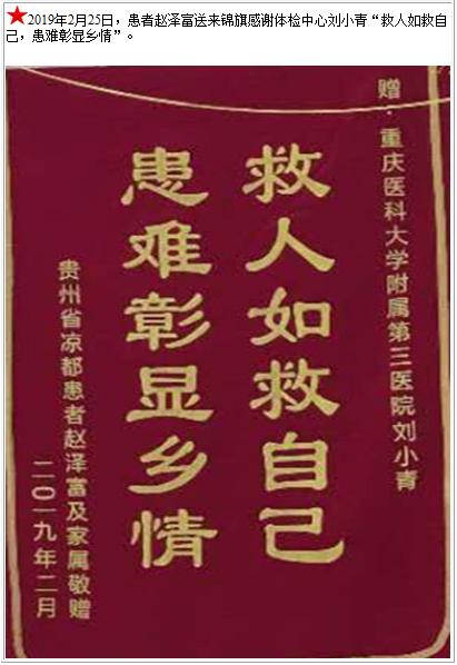患者赵泽富送来锦旗感谢体检中心刘小青-锦旗-患者心声-患者服务-重庆医科大学附属第三医院【官方网站】