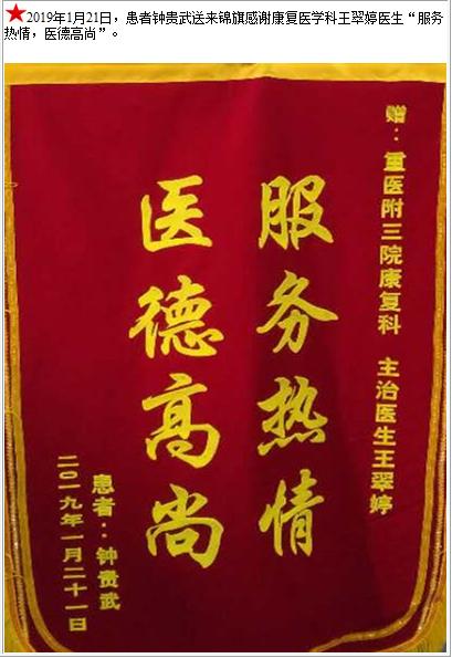 患者钟贵武送来锦旗感谢康复医学科王翠婷医生-锦旗-患者心声-患者服务-重庆医科大学附属第三医院【官方网站】
