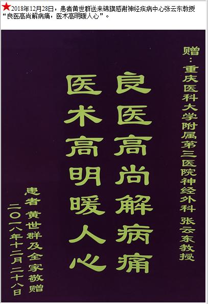 患者黄世群送来锦旗感谢神经疾病中心张云东教授-锦旗-患者心声-患者服务-重庆医科大学附属第三医院【官方网站】