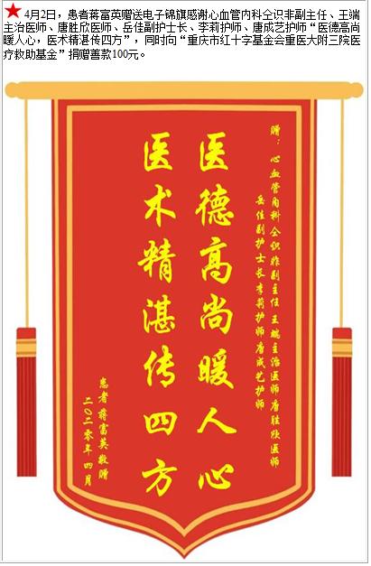 患者蒋富英赠送电子锦旗感谢心血管内科仝识非副主任等人,并向医疗救助基金捐赠善款100元