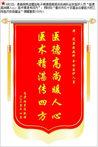患者胡其连赠送电子锦旗感谢感染疾病科全体医护人员,并向医疗救助基金捐赠善款100元-锦旗-患者心声-患者服务-重庆医科大学附属第三医院【官方网站】