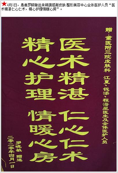 患者罗晓敏送来锦旗感谢皮肤/整形美容中心全体医护人员“医术精湛仁心仁术,精心护理情暖心房”-锦旗-患者心声-患者服务-重庆医科大学附属第三医院【官方网站】