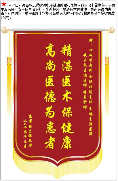患者杨志强赠送电子锦旗感谢心血管内科仝识非副主任等人,并向医疗救助基金捐赠善款100元-锦旗-患者心声-患者服务-重庆医科大学附属第三医院【官方网站】