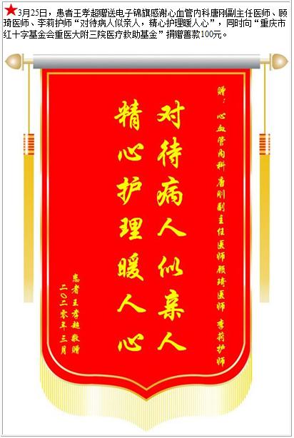 患者王孝超赠送电子锦旗感谢心血管内科唐刚副主任医师等人,并向医疗救助基金捐赠善款100元-锦旗-患者心声-患者服务-重庆医科大学附属第三医院【官方网站】
