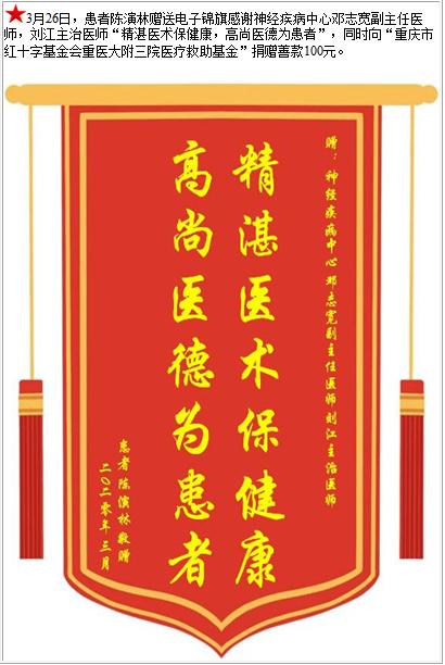 患者陈演林赠送电子锦旗感谢神经疾病中心邓志宽副主任医师等人,并向医疗救助基金捐赠善款100元-锦旗-患者心声-患者服务-重庆医科大学附属第三医院【官方网站】