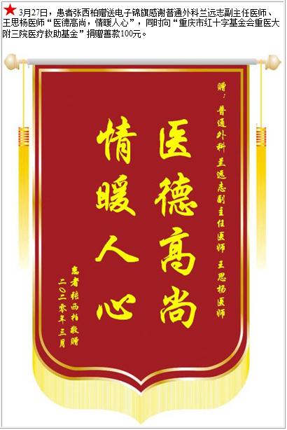患者张西柏赠送电子锦旗感谢普通外科兰远志副主任医师等人,并向医疗救助基金捐赠善款100元-锦旗-患者心声-患者服务-重庆医科大学附属第三医院【官方网站】