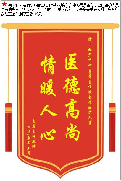 患者李玲赠送电子锦旗感谢妇产中心易萍主任及全体医护人员,并向医疗救助基金捐赠善款100元-锦旗-患者心声-患者服务-重庆医科大学附属第三医院【官方网站】
