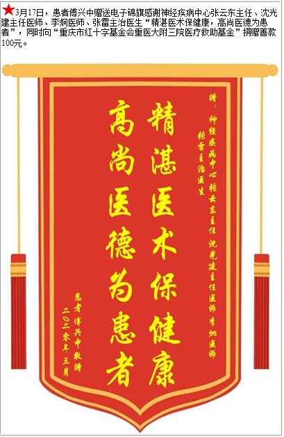 患者傅兴中赠送电子锦旗感谢神经疾病中心张云东主任等人,并向医疗救助基金捐赠善款100元-锦旗-患者心声-患者服务-重庆医科大学附属第三医院【官方网站】