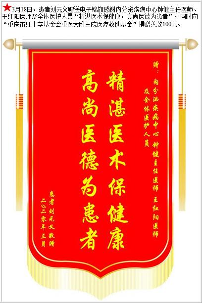 患者刘元义赠送电子锦旗感谢内分泌疾病中心钟健主任医师等人及全体医护人员,并向医疗救助基金捐赠善款100元-锦旗-患者心声-患者服务-重庆医科大学附属第三医院【官方网站】