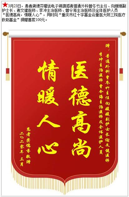 患者龚德芬赠送电子锦旗感谢普通外科曾冬竹主任等人及全体医护人员,并向医疗救助基金捐赠善款100元-锦旗-患者心声-患者服务-重庆医科大学附属第三医院【官方网站】