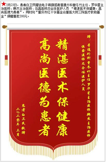 患者白卫民赠送电子锦旗感谢普通外科曾冬竹主任等人及全体医护人员,并向医疗救助基金捐赠善款200元-锦旗-患者心声-患者服务-重庆医科大学附属第三医院【官方网站】