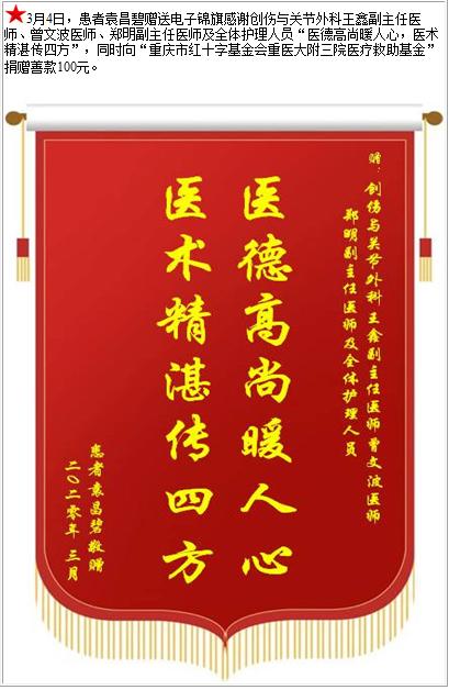 患者袁昌碧赠送电子锦旗感谢创伤与关节外科王鑫副主任医师等人及全体护理人员,并向医疗救助基金捐赠善款100元-锦旗-患者心声-患者服务-重庆医科大学附属第三医院【官方网站】