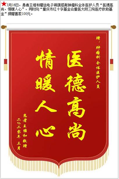 患者王维和赠送电子锦旗感谢肿瘤科全体医护人员,并向医疗救助基金捐赠善款100元-锦旗-患者心声-患者服务-重庆医科大学附属第三医院【官方网站】